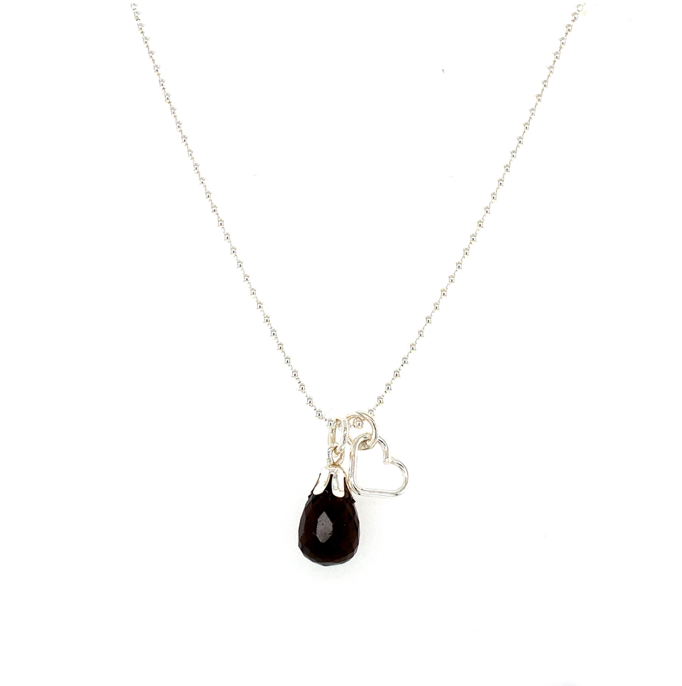 Zilveren balletjes ketting met rookkwarts druppel en open hartje.